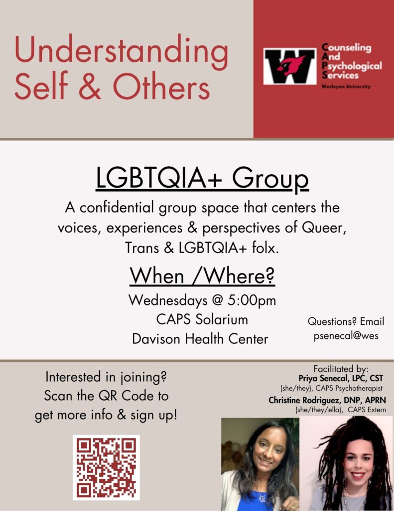 A confidential space that centers the voices, experiences and perspectives of Queer, Trans & LGBTQIA+ folx. Wednesdays at 5:00, CAPS Solarium, Davison Health Center Any questions? Email psenecal@wesleyan.edu.