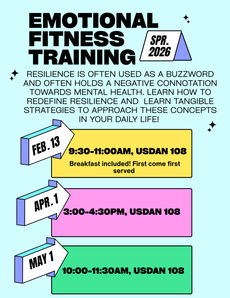 Join WesWell for a new training opportunity! WesWell is launching our own “Emotional Fitness” training this spring. This training allows students to redefine and explore their relationship with themes of resiliency, emotional regulation, and stress management. The goal is to help students better understand when resilience is necessary to push through challenges, and when we need to give ourselves time to recoup. This training will be held on 4/1/26 from 3:00-4:30 in Usdan 108. Cupcakes will be provided by Nora’s Cupcakes for attendees!