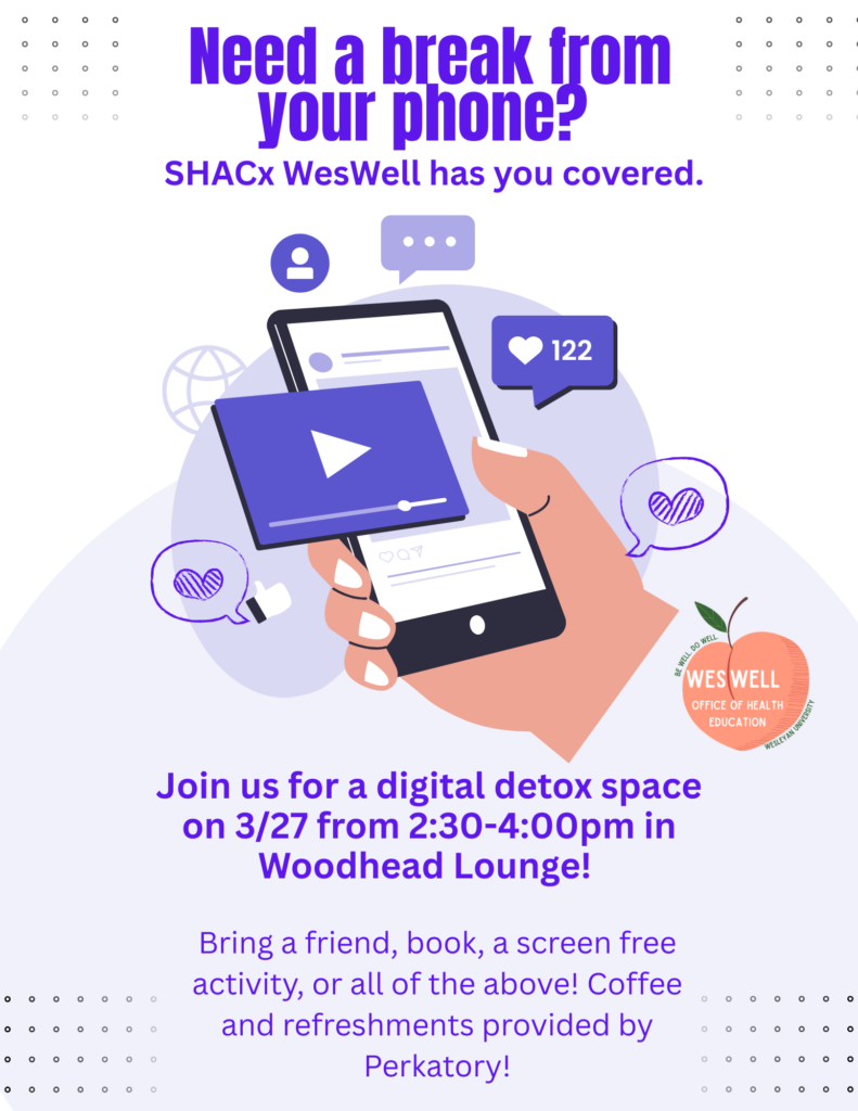WesWell and the Student Health Advisory Committee are collaborating on screen-free drop in space for students. We are hosting our first drop-in session Friday from 2:30-4:00 in Woodhead Lounge and will have coffee and light refreshments provided by Perkatory! We hope this event provides a space for students to engage in screen-free activities such as crafts, reading, or even mindfulness activities. We will also provide information and flyers about strategies to lower your screen time.