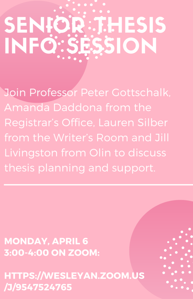 We’ll be having a Senior Thesis Workshop on April 6 from 3-4 featuring: